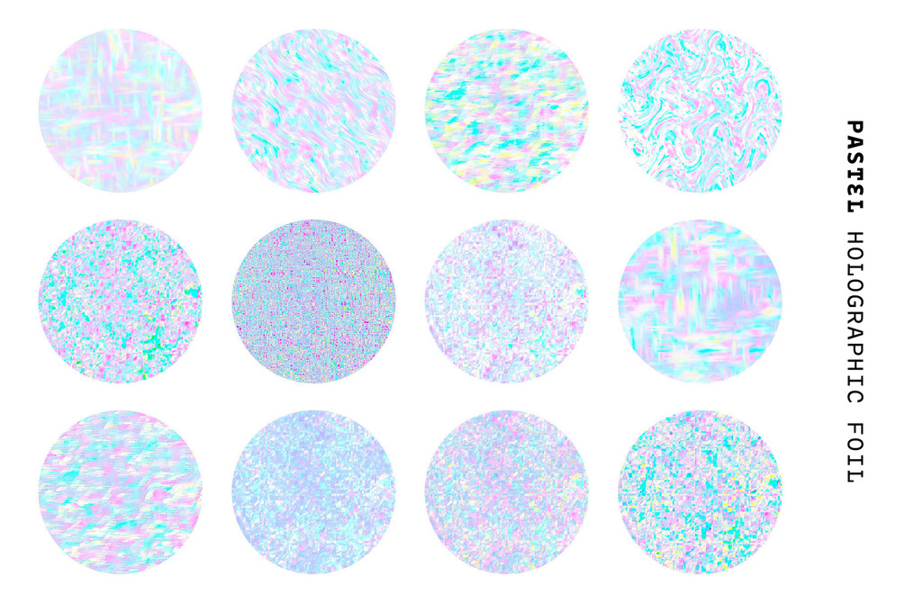 You'll get a collection of 48 high-quality retro-futuristic glitchy holographic foil textures in 4 different versions - bright, pastel, vibrant, white