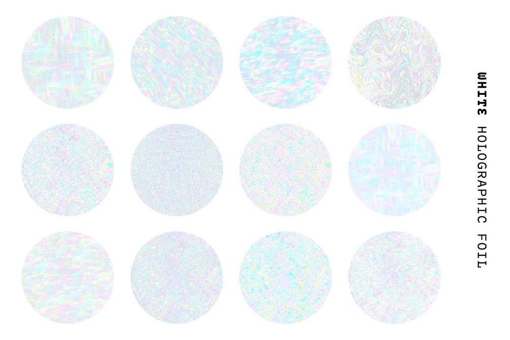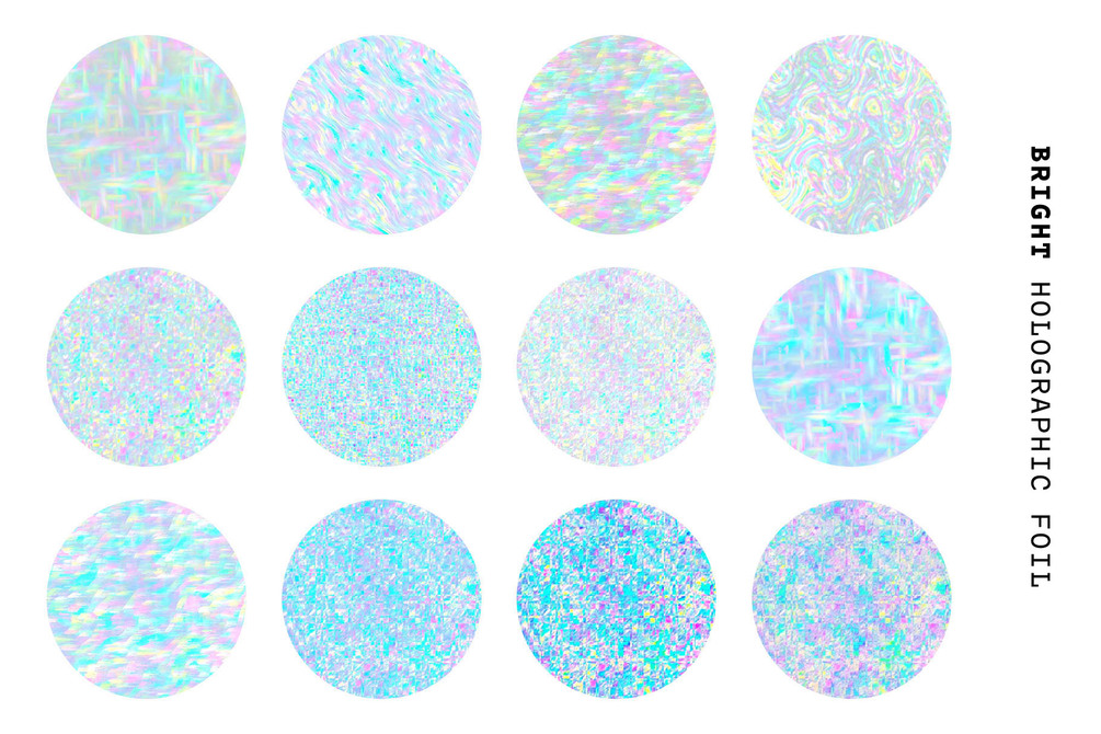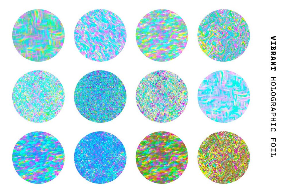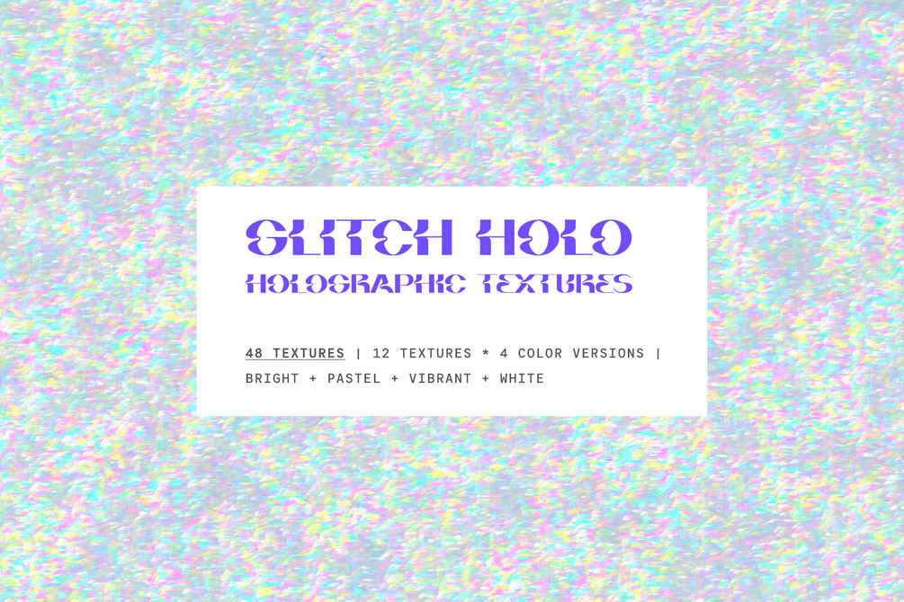 You'll get a collection of 48 high-quality retro-futuristic glitchy holographic foil textures in 4 different versions - bright, pastel, vibrant, white